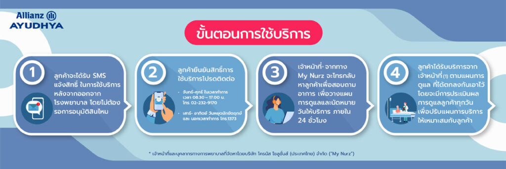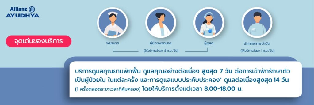 อลิอันซ์ อยุธยา ยังอยากให้คุณได้รับการดูแลจากมืออาชีพอย่างต่อเนื่องเหมือนอยู่ที่โรงพยาบาล หมดกังวลเรื่องการดูแลตัวเอง เพื่อให้การพักฟื้นเป็นการ “พัก” เพื่อ “ฟื้น” อย่างแท้จริง รวมไปถึงการดูแลแบบประคับประคอง (Palliative Care)* โดยไม่มีค่าใช้จ่าย ด้วยบริการดูแลคุณยามพักฟื้น (Nursing Care Service)